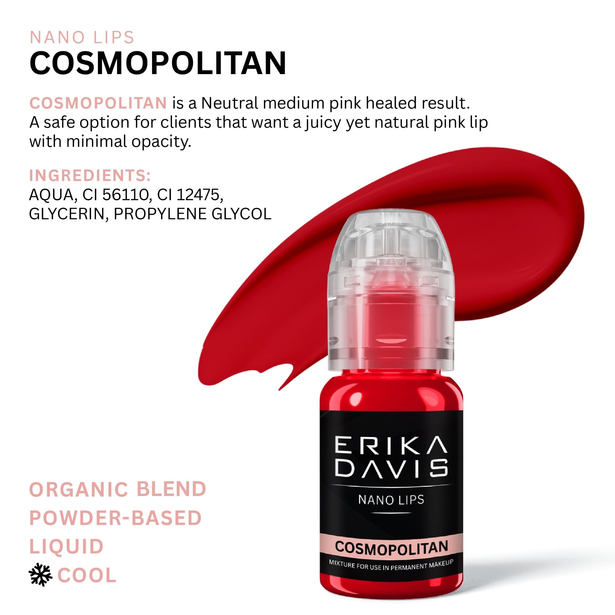 Cosmopolitan is a Cool, deep pink-red healed result. A safe option for clients that want a juicy soft pink-red lip result with minimal opacity.