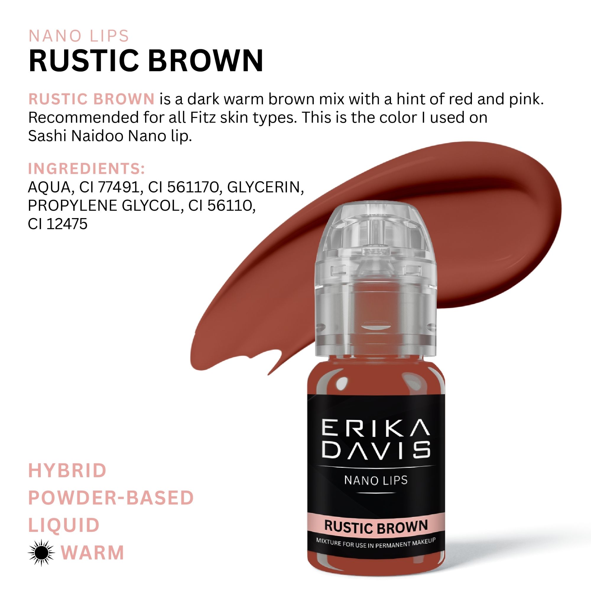 | Rustic Brown is a medium warm brown mix. Recommended for all Fitz skin types. This is the color I used on Sashi Naidoo Nano lip. Safe brown lip that will not heal cool. Can be used on Fitz 1-6. |